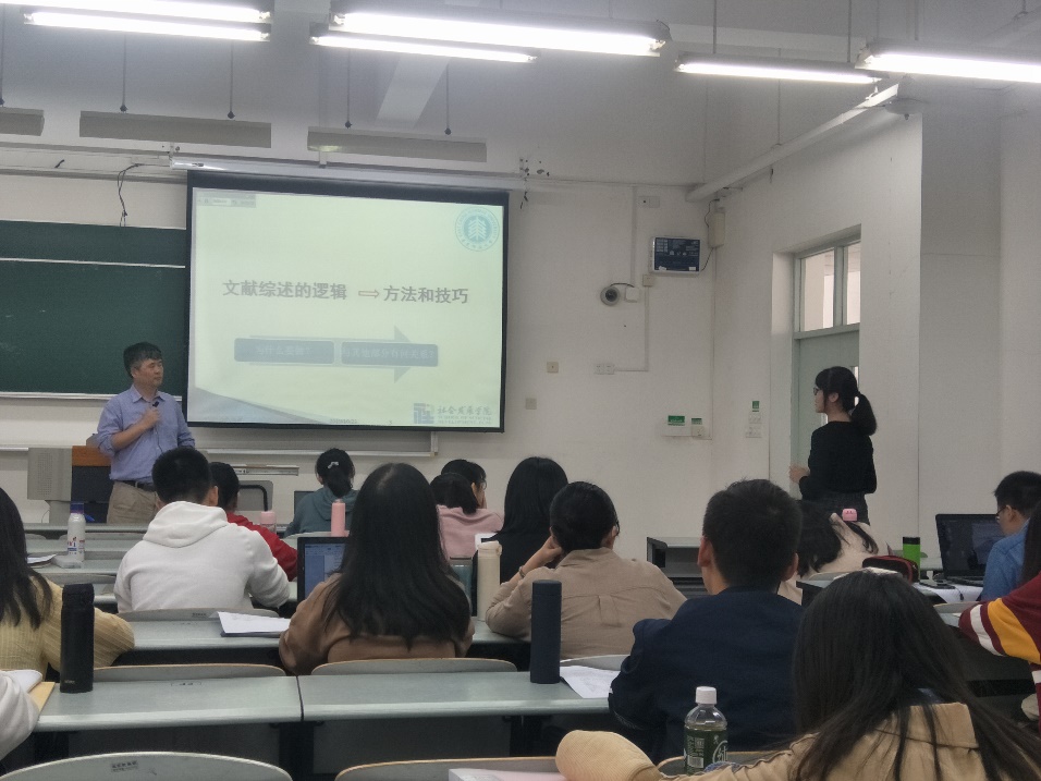 讲座伊始,黄老师和同学进行交流,了解同学们来听讲座的目的和需求,并对同学们的问题进行答疑。着重强调,在撰写论文的过程中,同学们要明确文献综述的目的和作用、探求背后的研究逻辑,理清文献综述撰写思路。