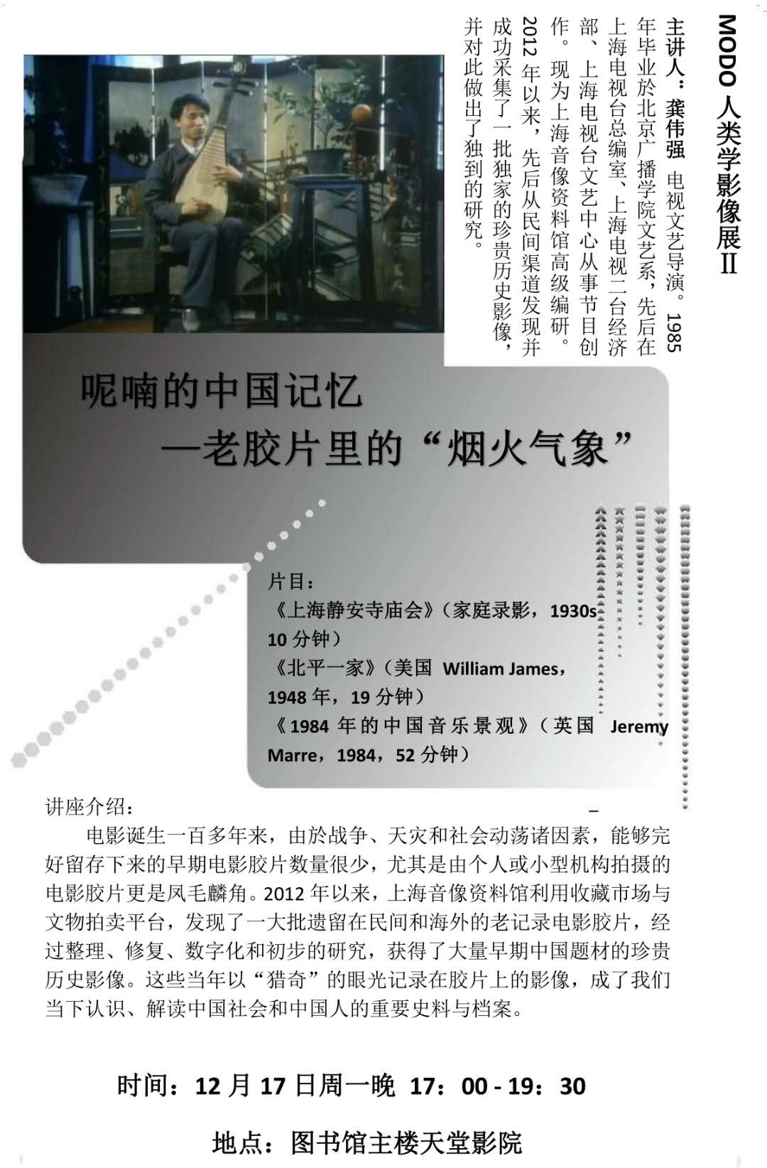 12月17日晚上17:00,主讲人龚伟强老师将带着三部珍贵的影像视频来与同学们分享。
