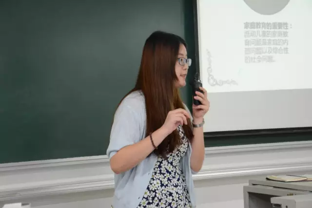 一开始,汪雪滢极强的表述能力使现场的听众在短时间内明白了流动儿童、家庭教育、社会支持三大概念。接着她以其清晰的思路,客观的分析,从内部支持网络和外部支持网络两个角度,较为全面地揭示了流动儿童家庭教育情况。