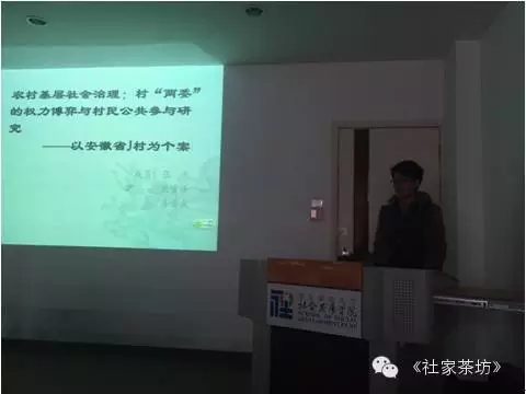 第三个答辩的是张雨同学,他关注的是“农村两委的权力博弈和村民参与农村治理”。通过采用民族志的研究方法以及参考相关学者的研究思路,他提出:基于村民个人的“股份制公司”在农村未来发展中将发挥巨大的作用。之后,老师就研究过程中采用的实地访谈和方案的可行性方面提出了一些意见和建议。