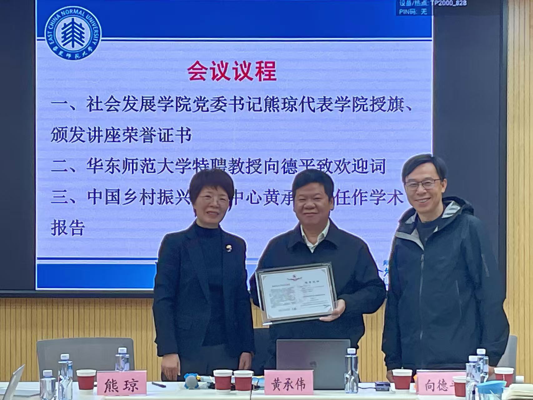 在讲座开始前,公司党委书记熊琼代表公司对黄承伟主任的到来表示热烈欢迎,并赠予荣誉证书及院旗。向德平教授也对黄承伟主任的到来表示欢迎,并向在场师生简要介绍了黄承伟主任的丰富履历和深远的学术影响。
