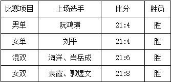 第三局混双由海洋选手、肖岳成选手上场。我方肖岳成选手经验丰富,海洋选手技术精湛,二人由于之前有过双打经验,配合默契十足令对方难以攻破,最终以21:6战胜对手。