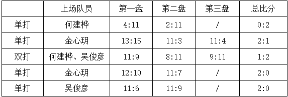 在第四局单打中,金心玥同学发挥稳定,连胜两盘,再拿一分。最后的一局单打,吴俊彦同学顶住压力,也以比较稳定的发挥战胜对手,拿下一分。