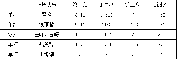 第四局单打钱预哲同学稳住心态,发挥较好,虽中间丢了一盘,但最后也拿下本局胜利。