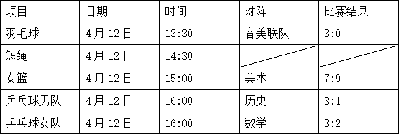 4月12日的短绳团体赛和个人赛开展顺利,最后的比赛结果须等待其他院系完成比赛后将予以公布。我们要充满斗志,在其他的项目上也努力拼搏,为社发争光!