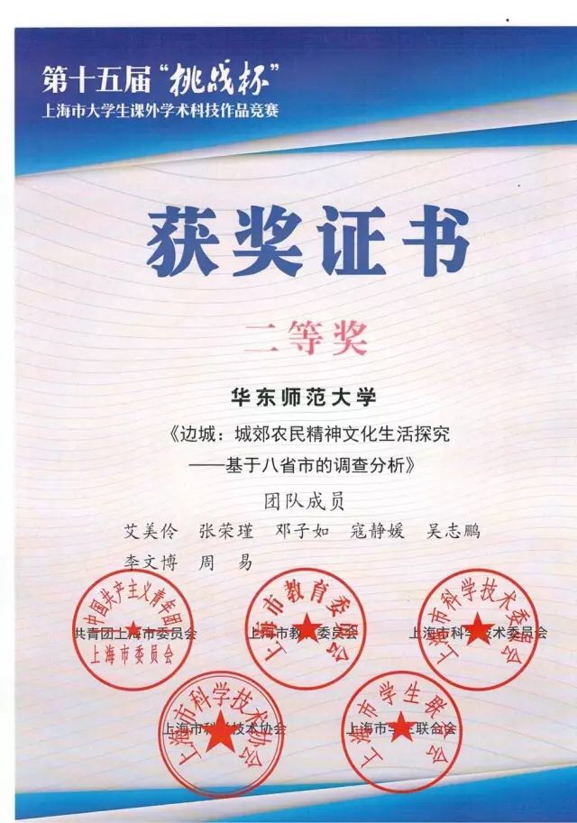 2017年6月9日至10日,由共青团中央、中国科协、教育部、全国学联和上海市政府共同主办的第十五届“挑战杯”上海市老员工课外学术科技作品竞赛在上海工程技术大学隆重举行。来自上海市40余所高校的数千名员工同台竞技,共展风采。公司选送的社会类作品《边城:城郊农民的精神文化生活探究——基于八省市的调查分析》作品荣获二等奖。该作品的参赛成员为艾美伶、张荣瑾、邓子如、寇静媛、吴志鹏、李文博、周易,指导教师为文军教授。