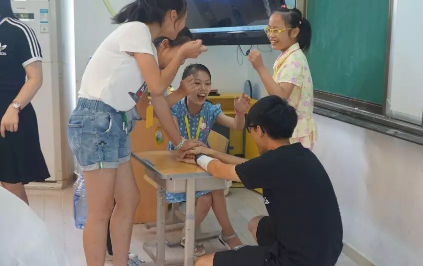 以学习为基础,以提升学习效果为出发点,强调服务与学习的连接,设定学习目标,并且通过执行及反思,获得新的体验和收获是本次夏令营的又一大亮点。夏令营课程突破了传统的教学模式,强调师生互动、体验式教学激发员工的内在潜能,提高员工的自主能动性。例如在15班的个人成长课程当中,香港理工大学的员工们在“如何解决冲突”这一主题的课堂中通过设置四种情境让员工们进行角色扮演,使得同学们不仅对冲突的类型有了直观的理解,而且非常有助于员工们将这些解决冲突的技巧应用到实际生活中。在课程过程中,服务团队对整个课堂的细节都非常的关心,对于如何使得小朋友迅速的安静下来、如何调动他们的积极性都有十分周全的考虑。在员工回答问题的环节,服务者会关注到不太积极的小员工,并且对他们进行眼神、肢体和语言上鼓励。在每天上完课之后,授课和评估员会对当天的课程进行交流。例如某位香港老员工在得到评估员对如何维持课堂秩序的建议之后,想出了一个技巧即在课堂正式开始之前与小员工们约定听到两声掌声之后就马上安静下来,这对整个课堂的有序运行起到了十分重要的作用。评估员和授课老师之间的交流与合作充分体现了服务的过程也是反思积累的过程,服务促进反思、反思提高服务。