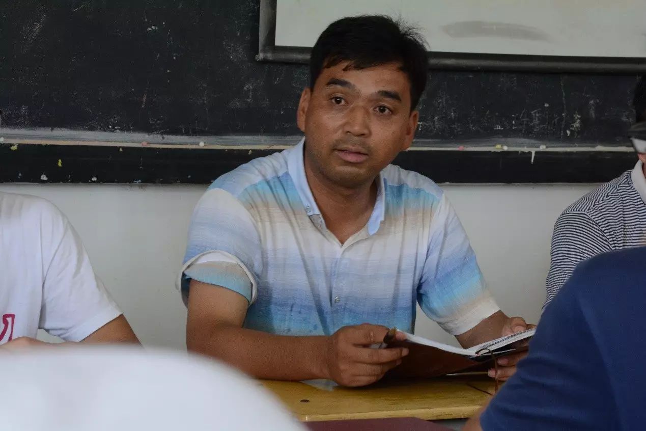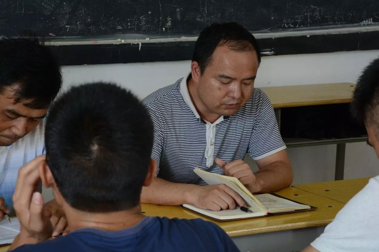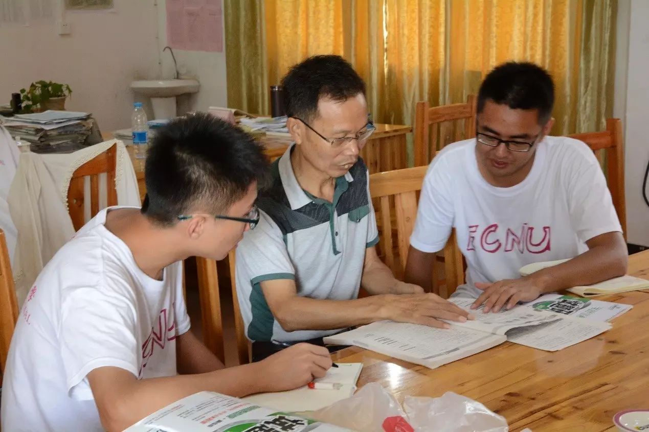 茅店中学刘瑞让老师与支教队吴正铎(左)与李睿(右)同学进行数学课程教学研讨