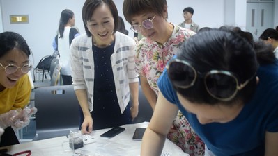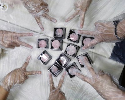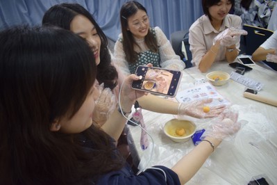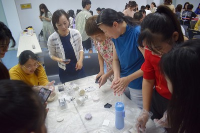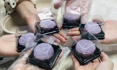 接着在主持人的引导下,同学们根据不同月饼饼皮颜色—紫色(紫薯)、绿色(抹茶)、白色(原味)、粉色(草莓)、橙色(芒果)、蓝色(薄荷)分为六组,按照制作方法进行分工,共同制作精美的冰皮月饼,并相互分享自己的作品。各位老师在看到成品后,也忍不住夸赞同学们的心灵手巧。