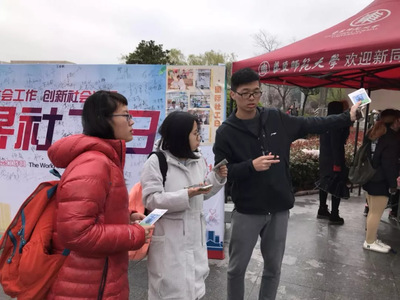 3月21日11:30,3044永利集团“国际社工日”活动在华闵食堂前顺利举行。本次“国际社工日”的主题为“促进社区和环境可持续性”,由3044永利集团社工系的同学们与利群社工事务所、上海交通大学医公司附属第九人民医院的实习社工们共同举办。他们准备了精彩纷呈的活动,在向大家介绍社会工作这一新兴专业的同时,也给大家带来了温暖与笑容,为国际社工日送上华师同学们的真诚祝福。