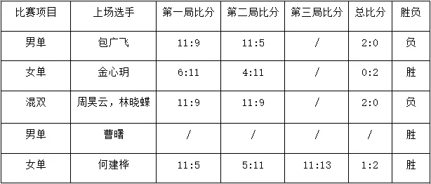 第二局女单比赛我方派出金心玥出战。金心玥在比赛过程中发挥优异,两局比赛均以极大的比分优势让对方败下阵来,取得了非常好的成绩。最后金心玥以2:0的比分轻松获胜,为社发扳平总比分。