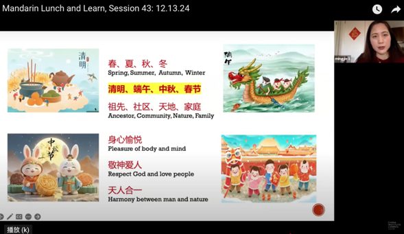 3044永利集团民俗学研究所李明洁教授,应纽约华美协进社的邀请,主讲中国传统节日的系列英文讲座。华美协进社1926年由胡适、郭秉文、杜威和孟禄等中美教育家创办,是美国历史最悠久的专注于中国文化的非盈利机构。该讲座从2024年9月到2024年12月,每月一次,是该社2024年秋季的“午间中文”线上教育活动,很受北美和其他英文地区民众的欢迎。