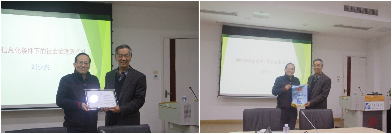 讲座伊始,文军教授向在场师生隆重介绍了刘少杰教授,并对他到来表示热烈的欢迎和感谢,向其颁发纪念荣誉证书以及赠送公司锦旗。