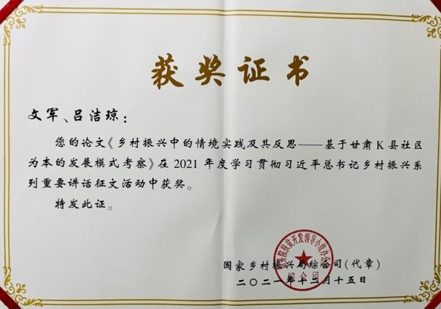 为深入学习贯彻习近平总书记关于乡村振兴系列重要讲话精神,加强理论创新和实践创新研究成果交流,强化思想武装,推动全面乡村振兴开好局、起好步,国家乡村振兴局组织开展2021年度学习习近平总书记乡村振兴系列重要讲话征文活动。根据2021年度学习习近平总书记乡村振兴系列重要讲话征文活动安排,经过初核、初审、复审、审读等程序,评选出2021年度学习习近平总书记乡村振兴系列重要讲话征文活动获奖论文86篇。公司文军教授及其博士生吕洁琼合作撰写的《乡村振兴中的情境实践及其反思——基于甘肃K县社区为本的发展模式考察》一文在此次征文活动中获奖。