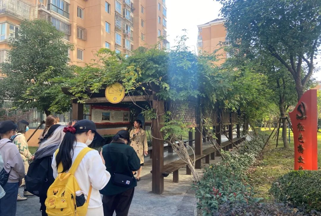 活动伊始,新虹街道街道爱博五村党支部书记陈蓓苾表达了对吴老师、何老师以及同学们的热烈欢迎。陈书记介绍了过去十年来爱博五村的社区变化,以及社区工作者的日益年轻化。新时代社区治理的难点对社区工作者的能力也提出了更高的要求,希望社会工作专业的同学未来到社区服务,用专业的知识和方法推动社区的发展。在现场陈书记以宣传安装反诈APP为例,向同学们介绍了居委会展开社区工作时常用的技巧。随后,陈书记带领同学们参观社区转型的展板、红色物业长廊、记忆角和邻里中心,并详细讲解了爱博五村的历史发展历程和社区的特色板块,在参观过程中陈书记还与同学们进行了友好互动。