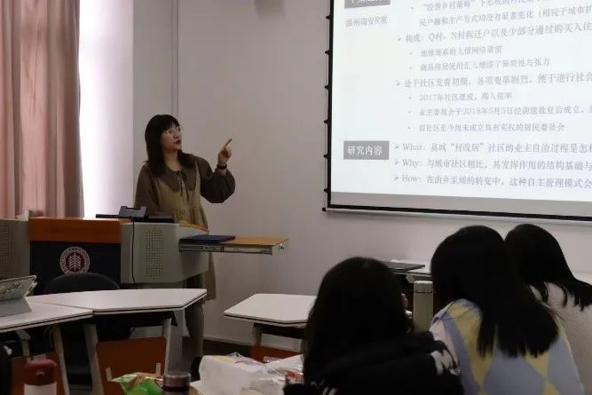 叶姝蝶学姐对村改居社区的业委会如何进行非正式自治,这些自治活动的组织和文化基础以及其可预期后果展开分析,同时用自己不断缩小选题、寻找创新点的亲身经历向学弟学妹生动呈现了确定选题的过程。
