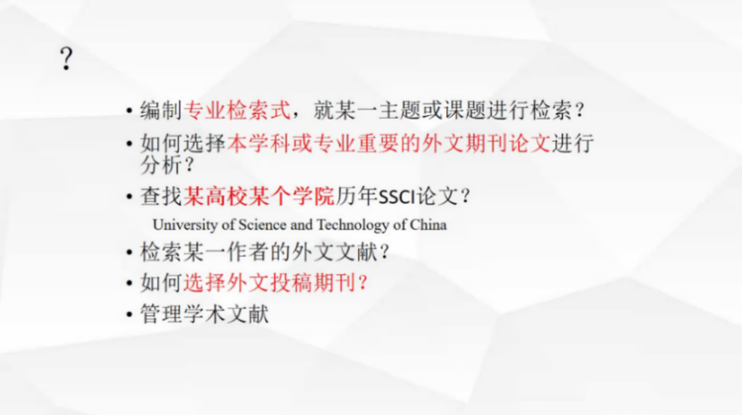 在检索的基础性知识中,宋老师汇总了同学们在文献检索时可能遇到的问题,主要包括如何编制专业检索式并就某一主题或课题进行检索、如何选择本学科或专业重要的外文期刊论文进行分析、如何查找某高校某个公司历年SSCI论文、如何检索某一作者的外文文献、如何选择外文投稿期刊以及如何管理学术文献等,并对这些问题一一进行了解答。