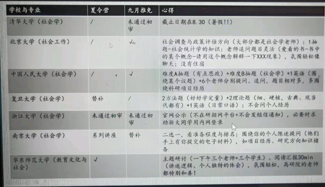 接下来,叶姝蝶学姐结合自身保研经历,详细介绍了保研的时间流程,即在5-6月准备保研所需材料,在7月中上旬参加夏令营,在9月初教育部会公布保研政策、确定保研名单,然后就可以准备九月中下旬的九推面试了。她还给我们分享了获取保研相关消息的信息渠道(关注保研岛等保研公众号)和保研需要准备的一些文书材料(获奖证书等),以及社会学专业的保研公司选择等内容。