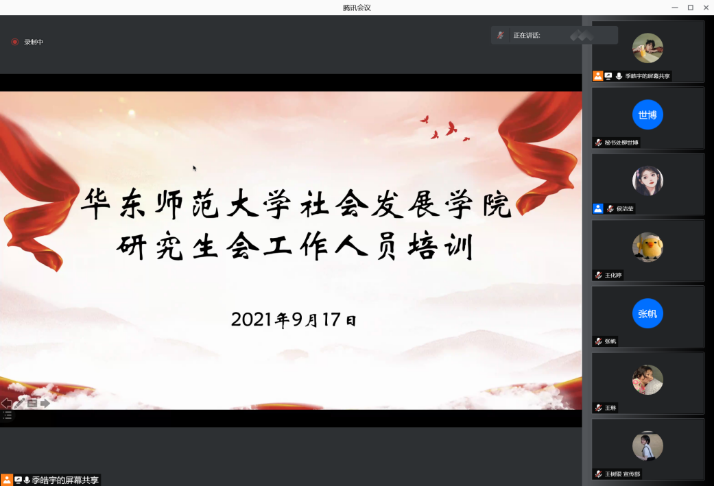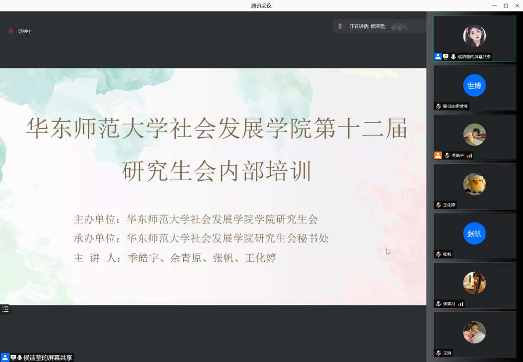 9月17日,3044永利集团第十二届研究生会第一次内部培训顺利进行。本次培训采用线上方式,第十二届研究生会主席团、部长以及干事参加会议,季皓宇、佘青原、张帆、王化婷担任培训主讲人,秘书处干事侯洁莹主持此次培训。