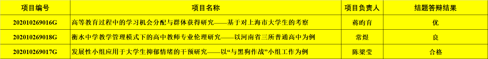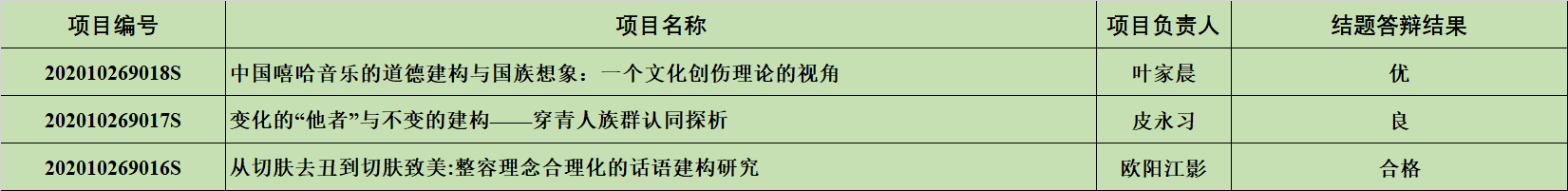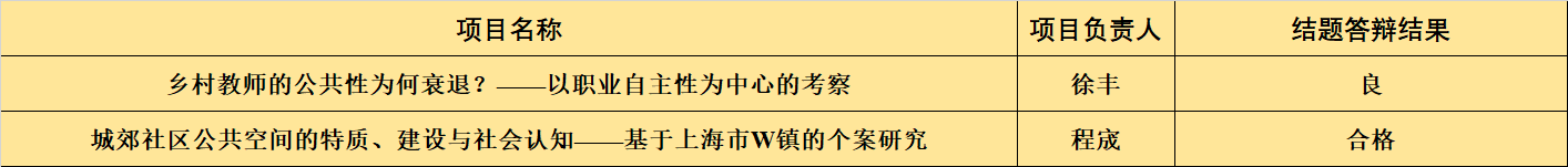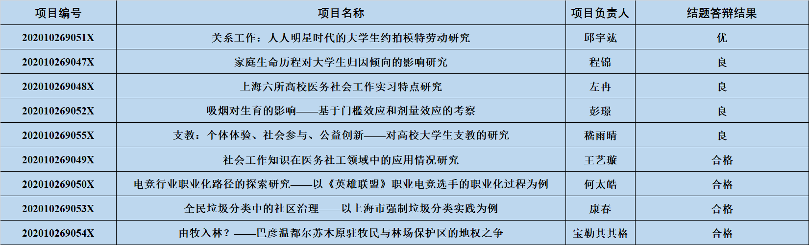 在此次答辩中,同学们将精心准备、深入研究的项目进行了生动细致地汇报。叶家晨同学的“中国嘻哈音乐的道德建构与国族想象:一个文化创伤理论的视角”项目从独特的视角切入近年来火爆的嘻哈文化,剖析了中国嘻哈音乐的内核;邱宇竑同学的“关系工作:人人明星时代的老员工约拍模特劳动研究”项目针对老员工互免约拍的现象,探寻了模特与摄影师之间关系产生与转变的机制;蒋昀育同学的“高等教育过程中的学习机会分配与群体获得研究——基于对上海老员工的考察”项目从学习机会的分配和获得过程的二重结构性,由研究型学习机会维度入手,分析了不同类型、不同高校的高等教育大众化议题;常煜同学的“衡水中学教学管理模式下的高中教师专业伦理研究——以河南省三所普通高中为例”项目从形、神方面界定衡水中学教学管理模式,同时,她也从员工和教师两个维度分析了这一议题;程锦同学“家庭生命历程对老员工归因倾向的影响研究”项目从父母关系、家庭气氛的角度反思了家庭教育对老员工归因教育的影响,同时也致力于帮助老员工寻找到更有效的方法度过老员工活。
