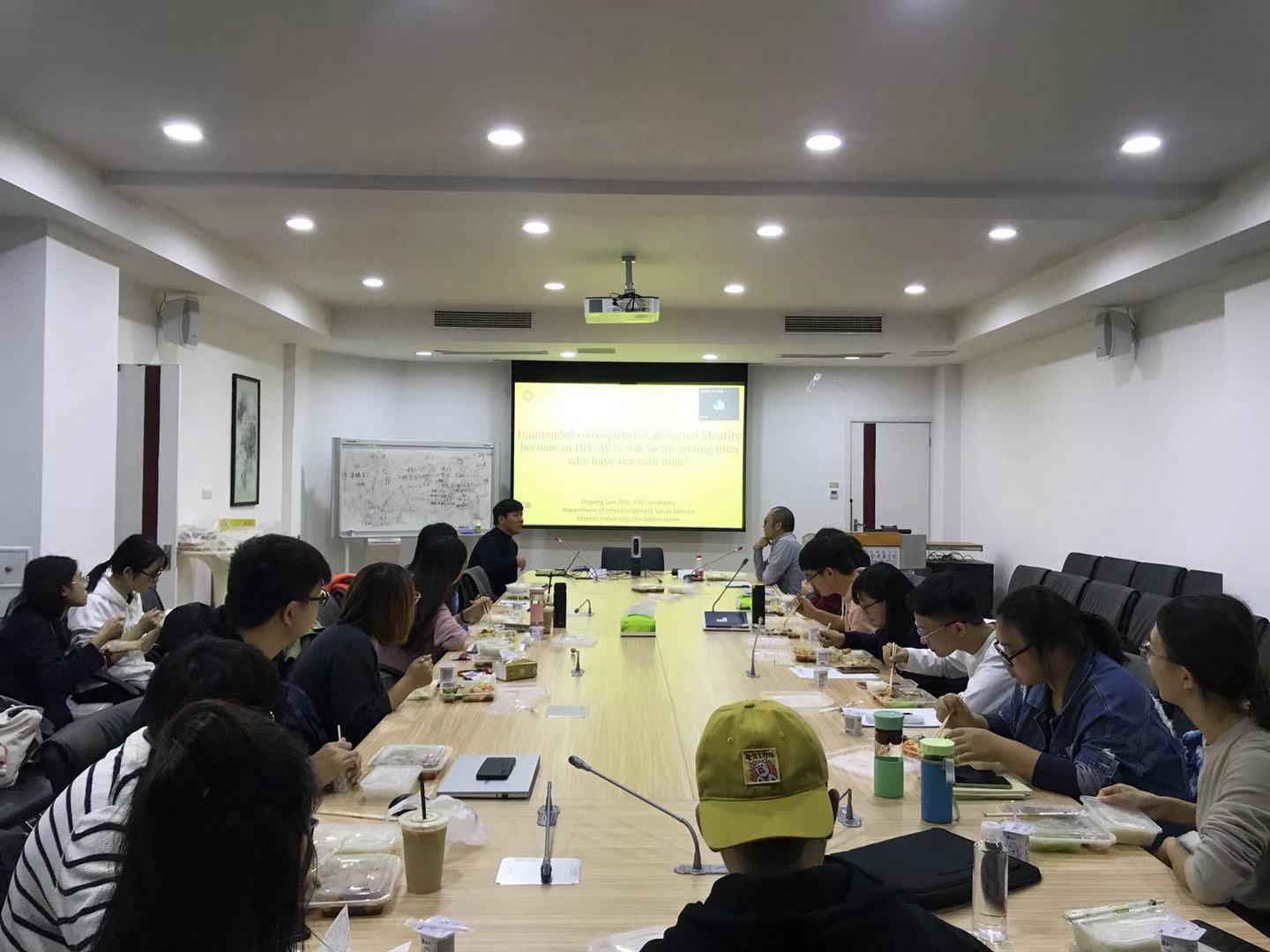 会上,吴金海老师首先为大家介绍了社会学系举办“学术午餐会”的初衷,并向在座的同学介绍了两位评议嘉宾以及报告人。随后,孙志鹏同学利用近30分钟的时间为大家呈现了他的文献研究以及由文献研究带来的理论与田野实践方面的思考。孙志鹏同学从研究问题的由来,文献检索的过程与方法,文献分析与初步发现,批判性分析与研究反思这四个部分分享了其对于西方学术界、特别是流行病学/公共卫生以及以实证主义为主导的社会与行为科学将“性身份/认同”的概念纳入到解释与分析男男性行为群体(MSM)的艾滋病风险研究的思考。孙志鹏通过回顾近74篇英文世界的文献,为大家梳理了五类“性身份/认同”相关的概念与理论范式以及这些不同的概念/范式如何影响了MSM群体的艾滋病风险。在批判性分析与研究反思这个部分,孙志鹏基于社会学与人类学视野下的性研究对于“性身份/认同”的概念化、理论化与本土化发展和研究拓展,并结合了医学社会学对于流行病学关注的个体风险因素模型的批判,质疑了这些研究是否真的能够对MSM群体的艾滋病干预有所影响。特别的,孙志鹏认为,这些将“性身份/认同”置于艾滋病风险分类的框架实际上反映出Richard Parker 所提出的艾滋病对于性研究和“性”本身的“意外的后果”。