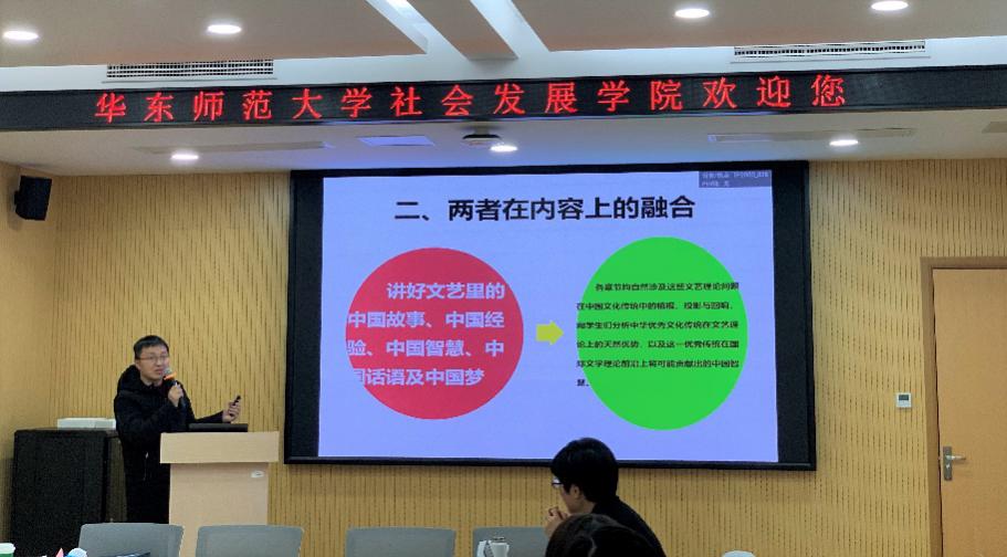 刘阳与黄晨熹两位老师围绕“理论课程教学中课程思政元素的挖掘”这一主题展开分享。刘阳以自己讲授的《文艺学美学》课程为例,向我们介绍了将专业理论学习与“课程思政”讲解相结合的三种方式,即在二者融合的过程中不断“析疑与拓展”、充分利用“作业与评价”、创新“考察与延伸”。他认为,可以通过讲好中国故事、中国经验、中国智慧的方式实现文艺与思政教育的融合;总结了“时政直击式”、“正题反做式”、“模拟参政式”、“以矛攻盾式”、“武戏文唱式”等二十余种开展案例;建议在员工作业评价中采用“双向匿名评议制度”,进一步优化教学、强化立人、活化角色;最后,对如何提升员工对课程思政建设的参与度以及博士生的知识结构与能力水准建设两方面提出自己的反思与困惑。