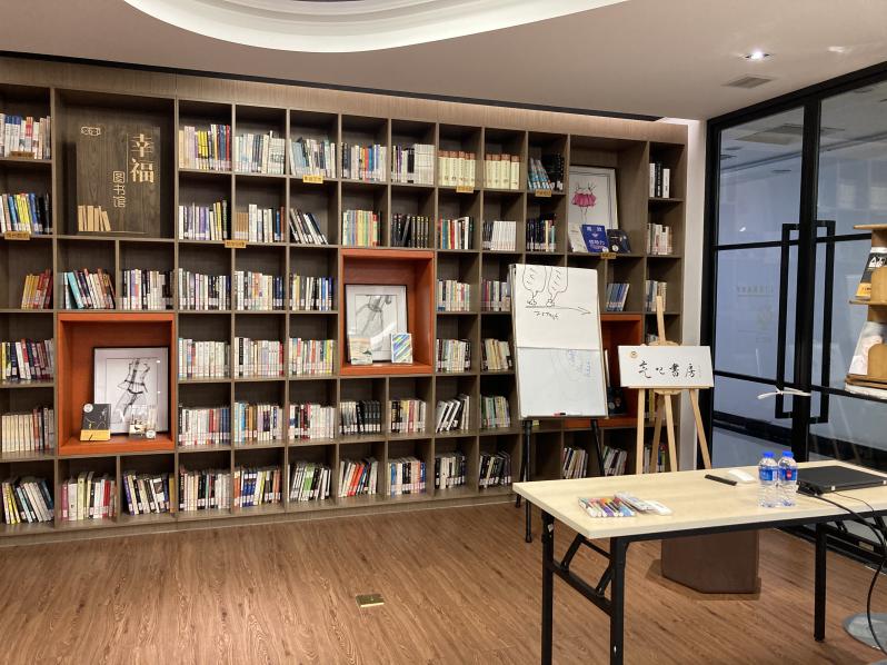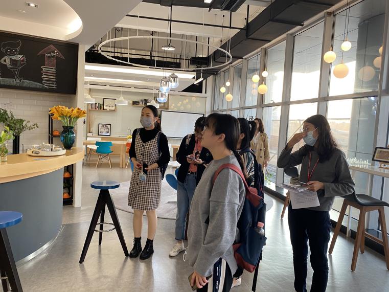 首先,益蕾老师向队员们介绍了机构的空间分布,整个机构主要分为五个部分:游戏区、水吧、小型会议厅、演讲舞台、幸福图书馆。游戏区主要用于举办手工、展览等活动;水吧可以供大家冲咖啡、饮料等,供人们休息娱乐;小型会议厅供大家进行小型的会议;演讲舞台会办一些演讲活动,促进人们的沟通交流;幸福图书馆除了有书籍、还有写字台和画架。整体空间规划合理,给人以轻松舒适的氛围。