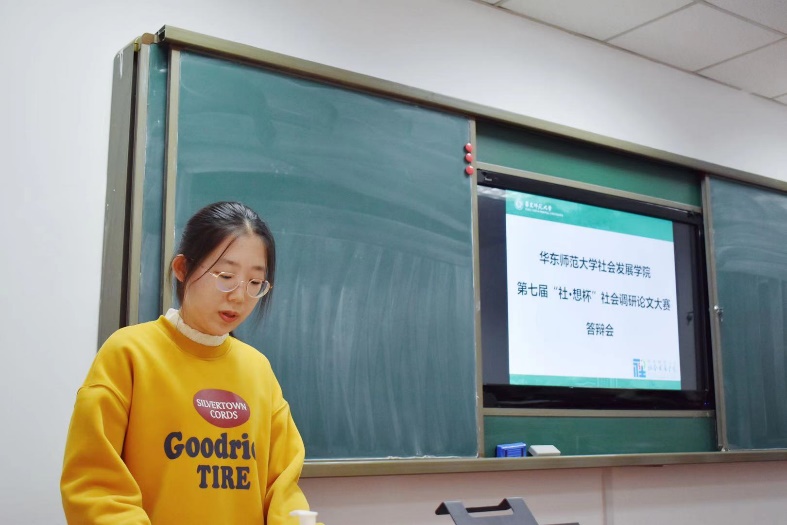 随后刘煜轩同学、郭宁同学依次进行答辩,分别展示了她们对“石油人”国家化身份认同以及网店刷单背后逻辑的社会调查研究。邱宇竑同学所在的小组关注“约拍”这一行为,从专业的视角分析约拍模特的关系工作,研究约拍模特的劳动。