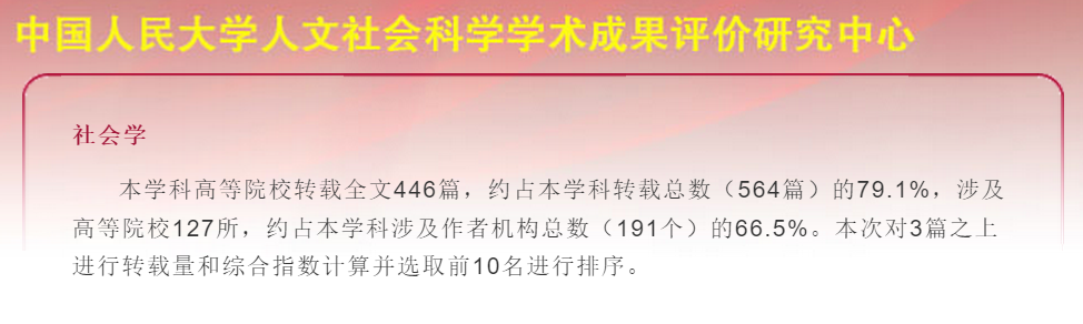 2017年度公司社会学学科转载量曾居全国第4,综合指数居全国第6。该排行榜和研究报告提供了有价值的客观数据和信息,在一定程度上反映了我国人文社科期刊阵营和学术研究机构的分类、布局、水平、变化和发展态势等状况,一直受到期刊界、教学科研机构和广大人文社会科学工作者的高度关注和广泛重视。