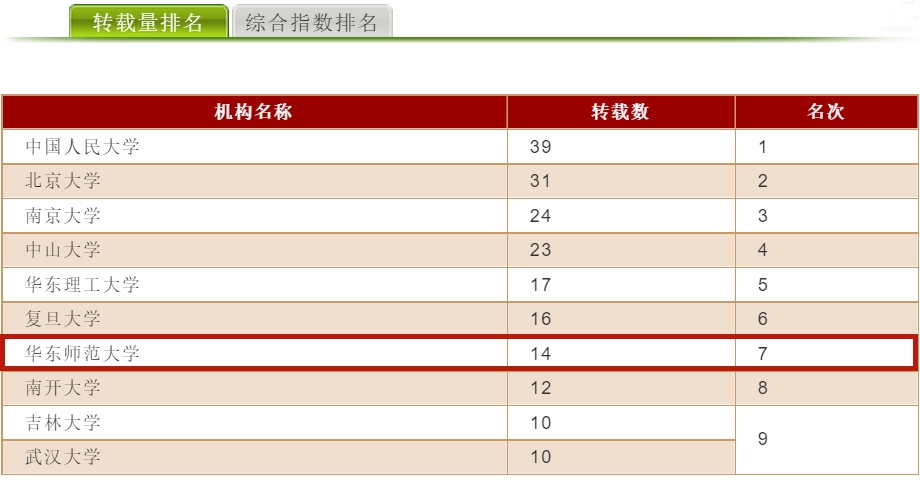 在高等院校复印报刊资料转载指数总排名中,华东师大转载量为268篇,转载量和综合指数均位列第四。其中,公司社会学学科转载量和综合指数居全国第七。