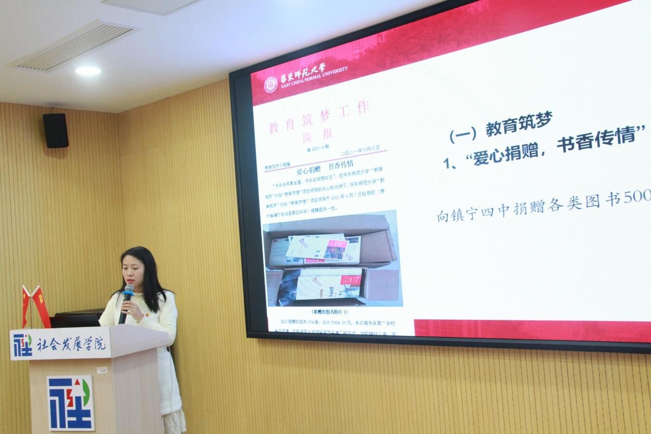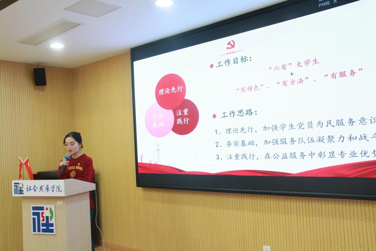 社会工作系硕士研究生党支部书记崔梦涵作“红色社工传播爱 公益汇聚正能量”主题报告,充分展现了社会工作公益服务的实践特征。