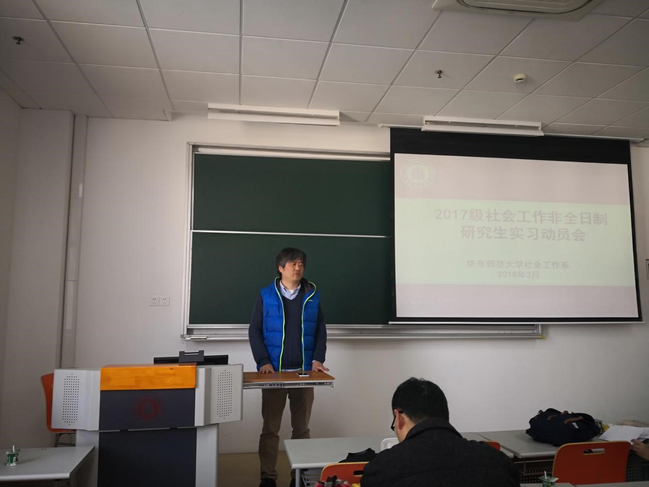 黄晨熹教授代表院系做动员讲话。他就社会工作专业实习在专业培养中的重要性、院系对员工成才的期待和所做努力进行了详细阐述。他表示,社会工作专业实习是社会工作专业的生命线,院系将严格按照专业培养和实务教学要求对非全日制研究生专业实习进行安排和督导,无论是在课程,还是在实习上,院系都尽力保证团队的专业和到位,期待同学们在实习中得到充分锻炼,以共同为行业输送具有专业技能、反思能力和创造能力的人才。