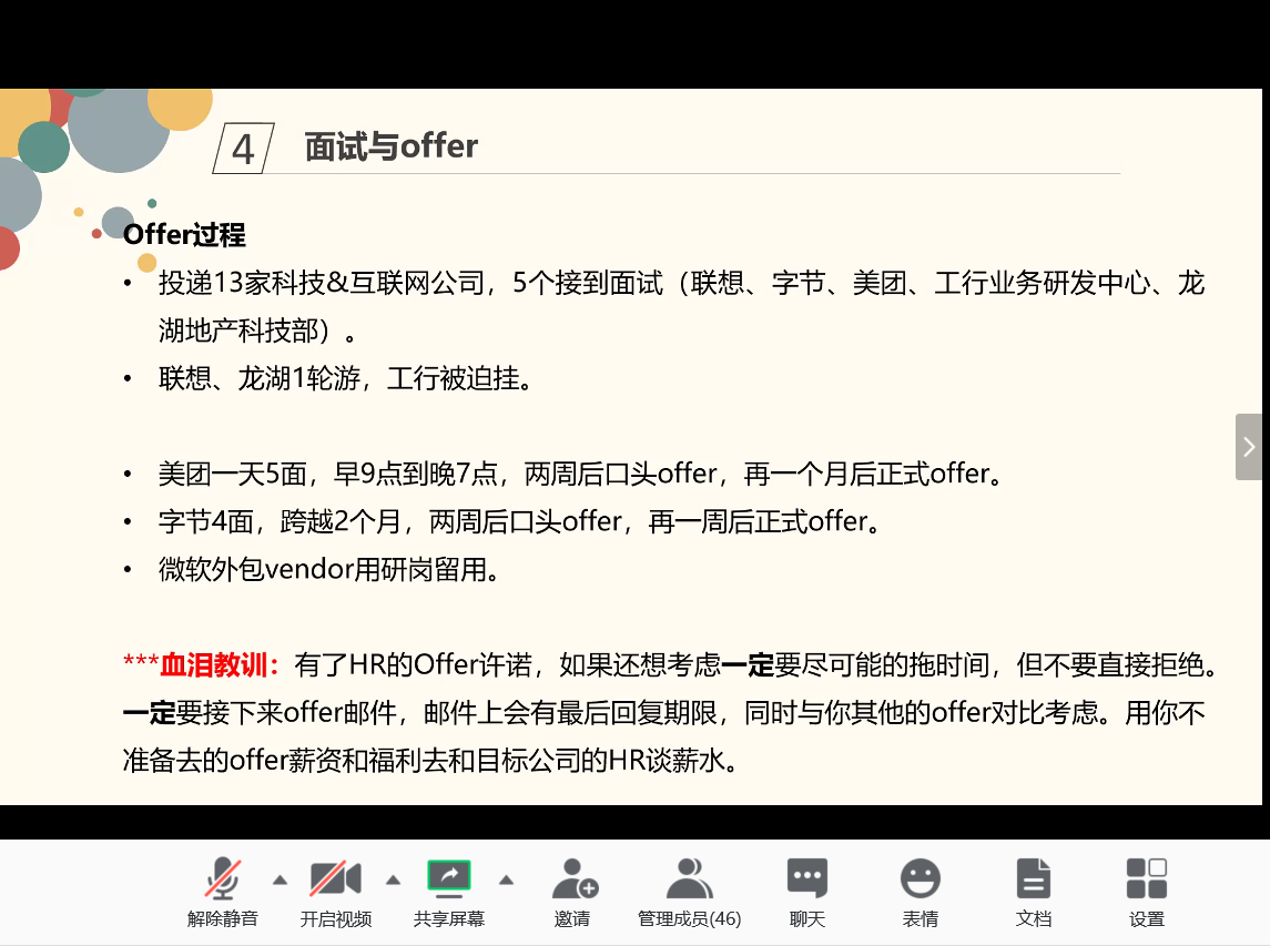 第二节是张梦泽学长的就业分享,他现已签约上海字节跳动。学长主要是依据同学的问题进行分享,着重强调了除了在大型招聘网站上收集信息,还要关注一些少见的招聘渠道,比如职业内部的微信群,以及在收到电话通知录用时时一定要公司的正式邮件offer,以用于后期与其他公司谈薪资条件。针对自己未来方向不是很明确的同学,学长的建议是多实习多体验,在这个过程中或许可以找到自己的兴趣点。学长特为我们提供了上海字节跳动的内推码:GNMNSJN;投递链接:https://job.toutiao.com/campus/,有兴趣的同学可以作进一步了解。