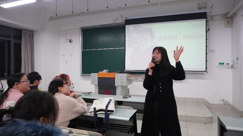 12月3日晚,毕业于公司2014级社会工作专业、目前任职于佰特公益的李焕学姐回到母校,在闵二教331教室为《社会工作概论》课程的同学们及“大哥哥大姐姐”计划的志愿者们带来了一场以“探索自我,拥抱未来”为题的精彩讲座。社会工作系的赵鑫老师主持了本场讲座。