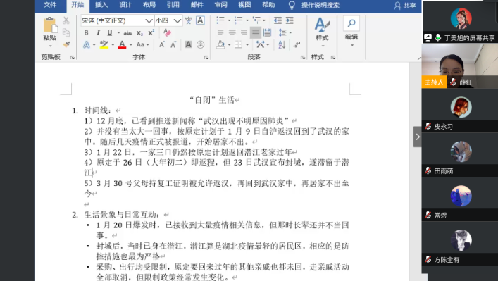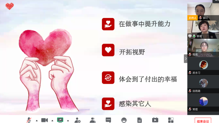 4月16日(周四)15:00,武汉的蔡璐老师来到3044永利集团《社会公益与创新》的课堂,进行“我在武汉做社区志愿者”的主题分享。本次分享通过腾讯会议线上进行,由3044永利集团薛红老师担任主持。
