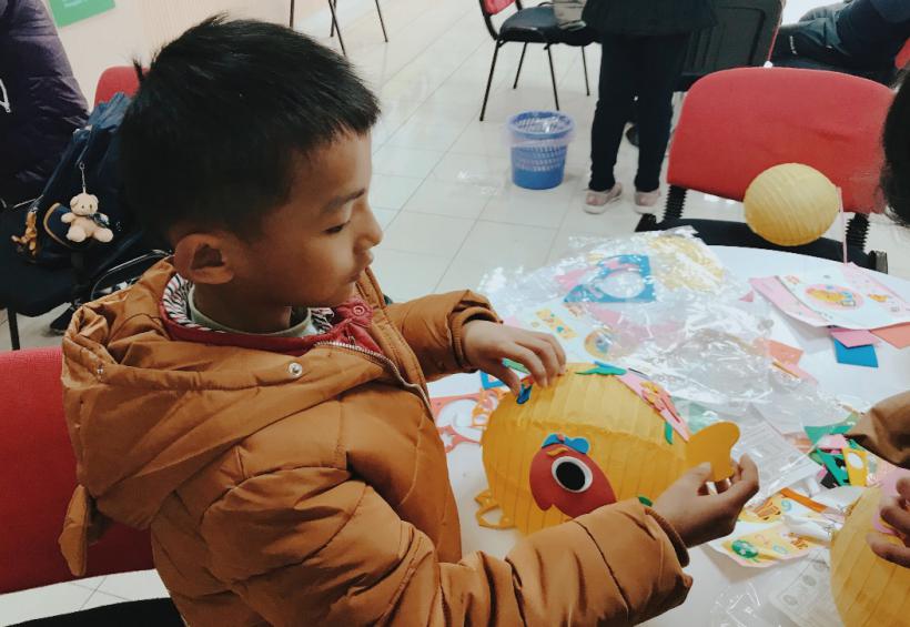 接下来,志愿者为小朋友播放了一段手工达人制作灯笼的视频,小朋友看得兴致勃勃。视频刚刚播放完,有的小朋友就开始跃跃欲试,想要自己动手制作灯笼。在小朋友的期盼下,课程到了最为核心的环节——制作手工DIY灯笼。虽然在制作的过程中有很多困难,但是在志愿者的帮助下,小朋友都成功地制作了属于自己的灯笼。他们脸上都洋溢着欢乐的笑容,第一天的授课活动也在欢声笑语中迎来了尾声。