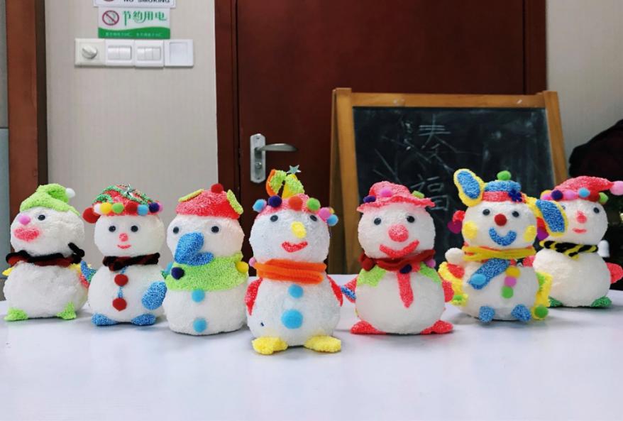 在小朋友的讨论声中,活动进入最为激动人心的环节,自己动手做一个雪人。小朋友需利用泡沫制作的雪人模型与彩泥,自主设计或参照PPT上所给的样式,制作雪人。拿到雪人模型与彩泥的小朋友兴奋极了,似乎是真得在堆雪人。有的在认真的思考该给雪人穿什么衣服、佩戴什么颜色的围巾,有的在仔细地调整雪人眼睛、鼻子、嘴巴的距离,还有的利用剩余材料,做了几个雪球,与同伴打起了“雪仗”,不亦乐乎。