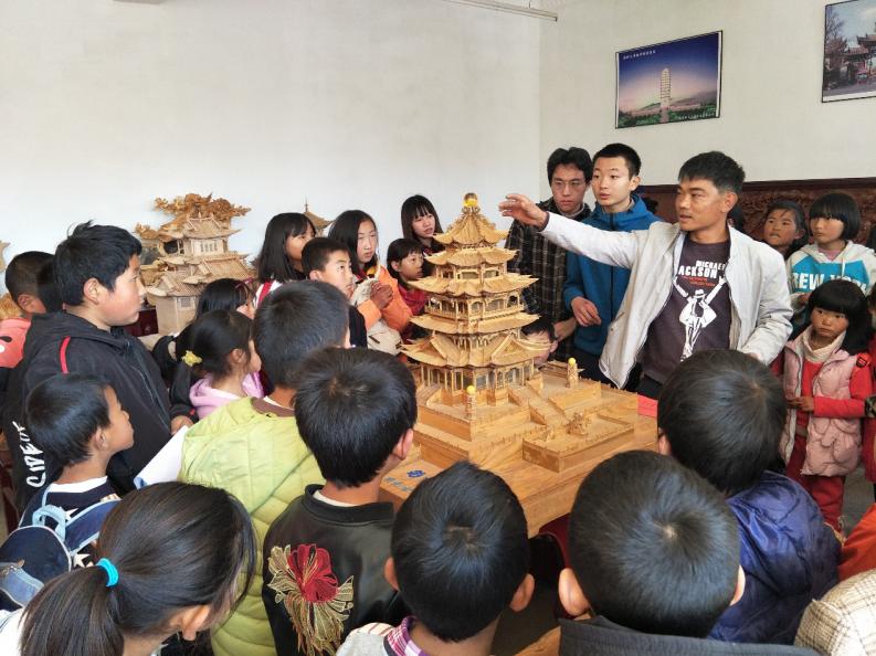 随后乡土建设学社的志愿者寓教于乐,用生动有趣的方式带领孩子们进行英文诗歌早读,用简洁易懂的形式给孩子们讲解科学实验,激发孩子们的探究兴趣。并且秉承着“让孩子回归本土文化根源”的理念,认真带领孩子们探索感知剑川木雕工艺的源远历史文化。