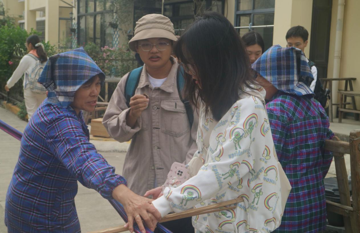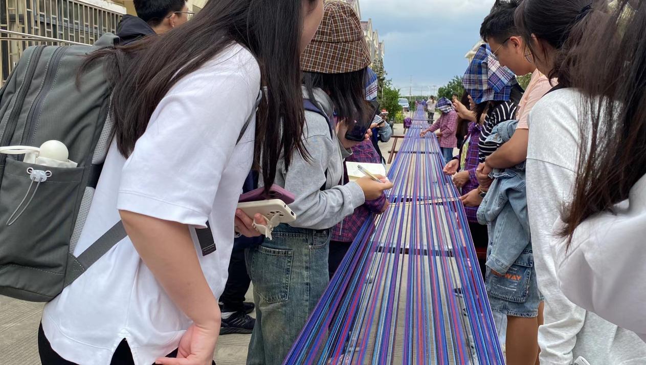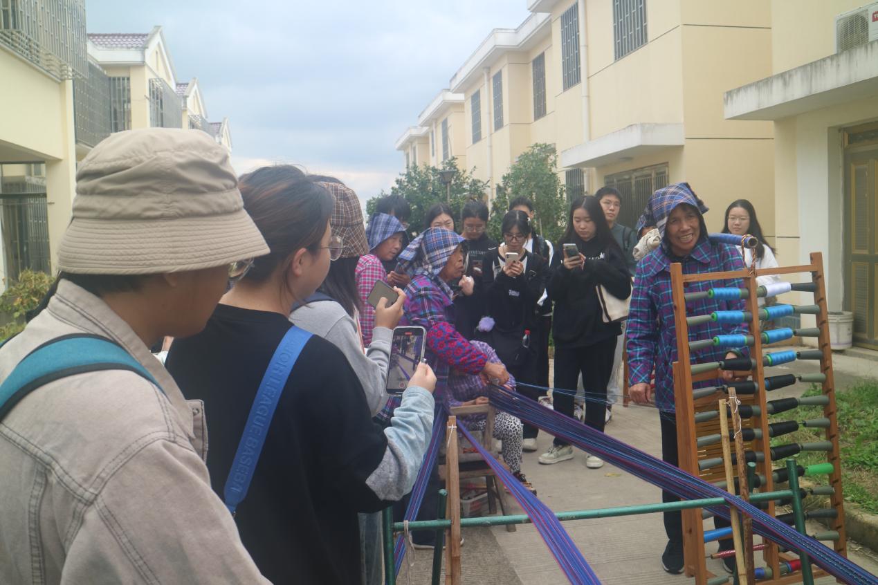 同学们于1时许到达时,盐行村的李四华等10余位上海手工棉纺织传承人已着土布上衣和土布头巾等候多时。经布活动在李四华娘家门前的道路上进行,同学们完整观看了经布过程中的排线、穿篙竹、盘布等步骤,许多同学还亲身参与其中。这匹布并非由一家所有,而是要四五家分的。因此,同学们还幸运地看到上海手工棉纺织传承人如何通过一条白线来做标记,以便更好地了解已织布匹的长度,同时便于之后大家的分割。经布程序结束之后,这些手工棉纺织传承人将于明天开始穿综活动。这之后,李四华老师还将自己新织的土布以及过去织的土布拿出来与大家分享。分享结束之后,同学们在盐行村村里自由活动20分钟,以寻找村子里哪些地方还在使用土布。