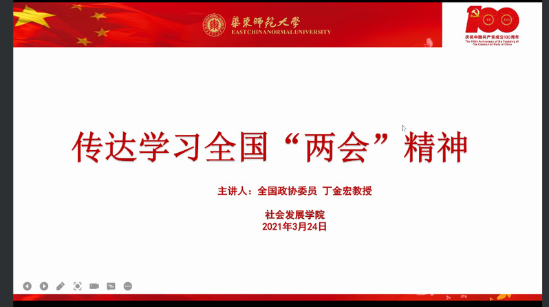 动员会后,全国政协委员丁金宏传达全国两会精神,丁金宏委员结合自己参加“两会”的切身感受,重点讲解了政府工作报告、王沪宁与社会科学界别政协委员的座谈交流会以及全国人大关于完善香港选举制度的决定等主要内容。首先,丁金宏委员谈到,今年全国政协创新工作方案,利用主题读书群深入开展委员读书活动,以“书香政协”助推“书香社会”建设,并将中国特色的“协商民主”作为一种文化进行讨论,促使委员做到各抒己见而又乐于互动,谋有差异而又善于求同。其次,丁金宏委员认为,今年的政府工作报告体现了中国政府一如既往地扎实进取,在疫情之下,中国仍然交出了人民满意、世界瞩目、可以载入史册的答卷:中国是唯一实现经济的正增长国家,GDP突破1万亿门槛;中国的脱贫攻坚战取得了全面胜利;决胜全面建成小康社会取得决定性成就。我国“十四五”期间经济建设的目标包括继续推进城镇化,常住人口城镇化率提高到65%;人均预期寿命再提高1岁;财政赤字率控制在3.2%等。最后,作为全国政协社会科学界别委员,丁金宏委员分享了中央书记处书记王沪宁对于社会科学工作者的三点期待:第一,坚持正确的政治方向,将“以人民为中心”作为研究导向;第二,提高学术的原创性,建设中国社会科学的学科体系;第三,社会科学工作者应加强对社会现实的研究。