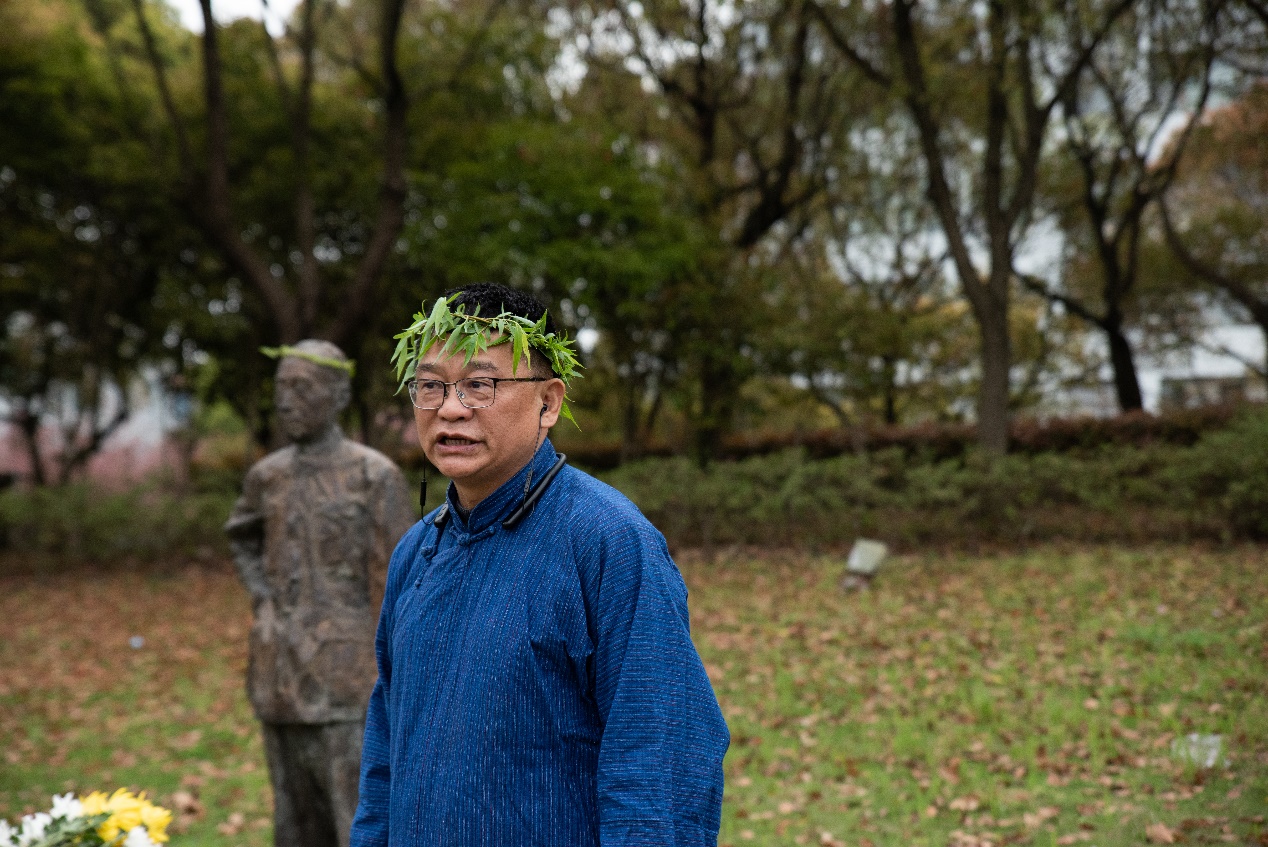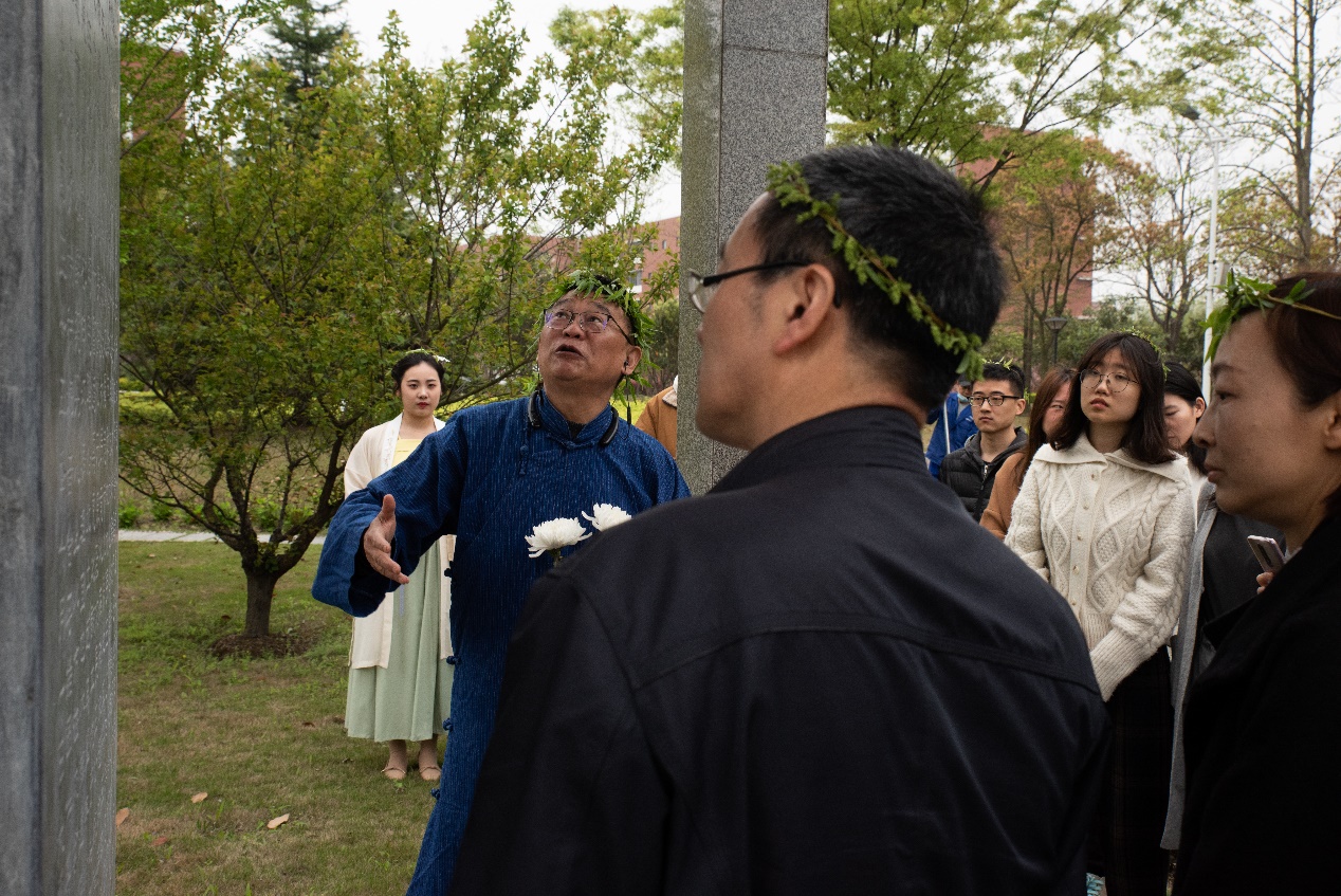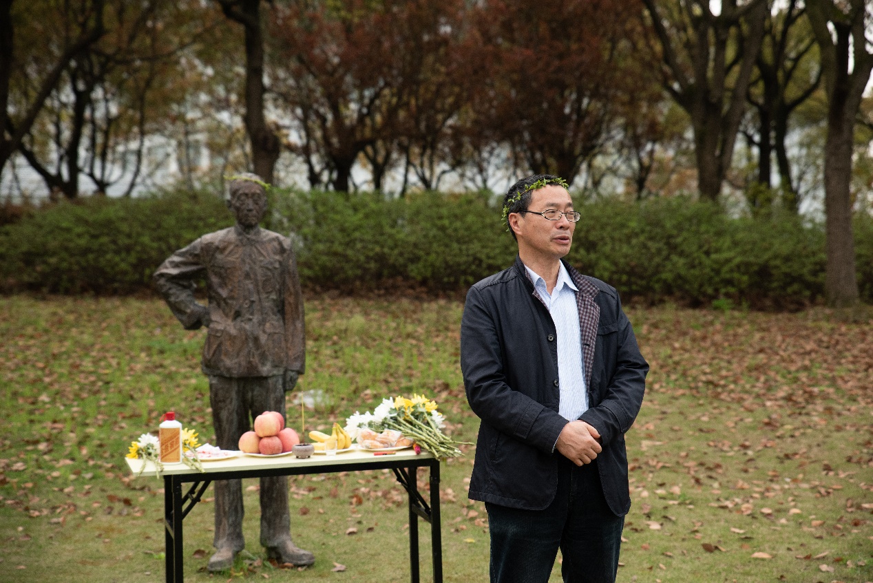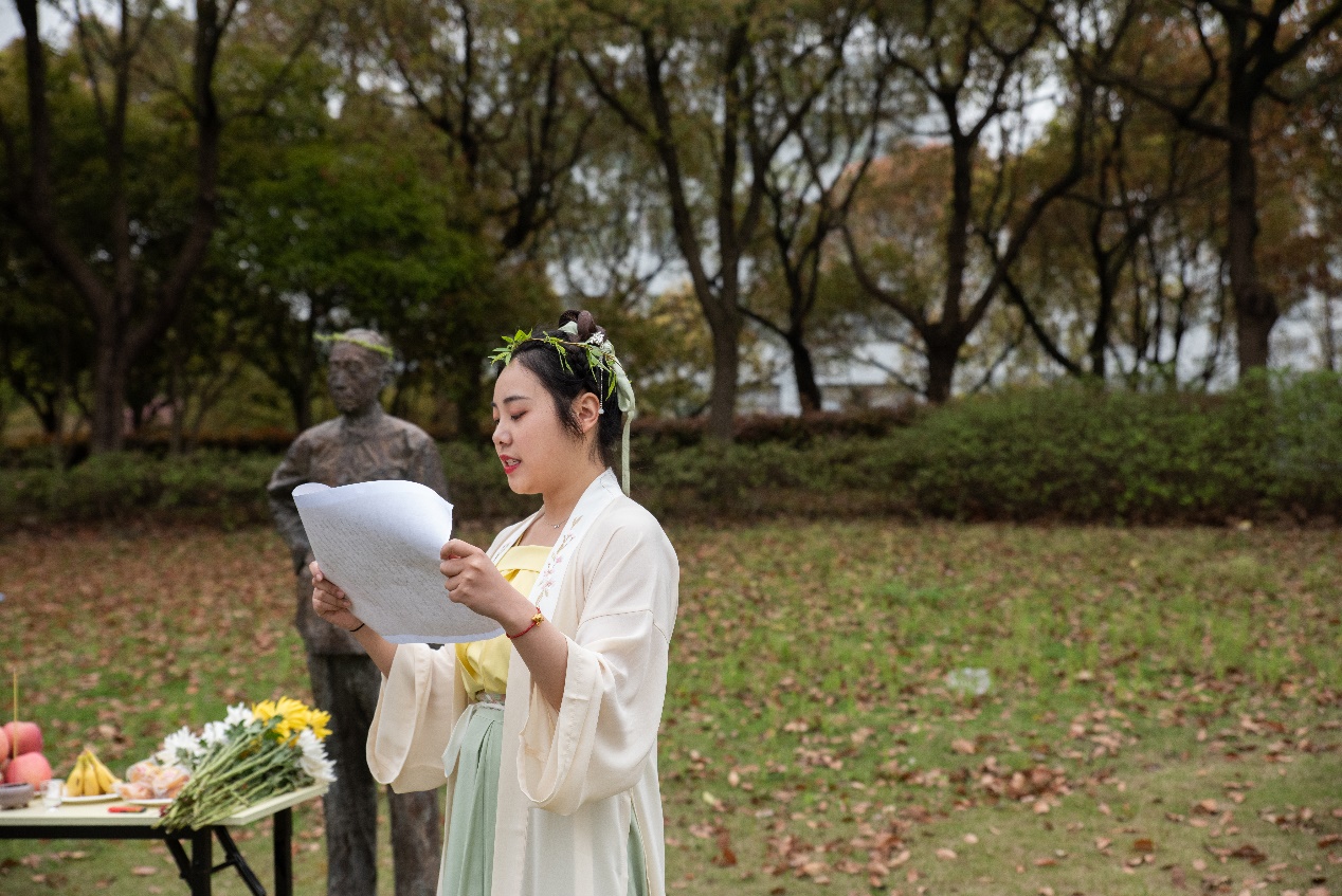 默哀结束,祭祀师大先贤的活动正式开始。孟宪承老董事长的雕像前,师生们庄严肃穆,凝视着老董事长的雕像,在司仪深情的主持下,激发师生们无限的哀思和感伤。教师代表徐赣丽、黄燕和陆芳萍分别为老董事长戴柳、进香、奠酒,现场师生为孟先生献花,用素菊表达对先生的敬仰和怀念之情!之后,员工代表张帆诵读祭文,回顾了老先生的求学和治学理想,在深情的诵读中,师生共同感悟孟先生的志向。祭文诵读完毕,黄燕带领师生共同诵读孟宪承董事长的教育理想:智慧的创获、品性的陶熔、民族和社会的发展。在诵读中,师生们加深了对孟董事长教育理想的认识,也更加感悟到了师大的校园精神。