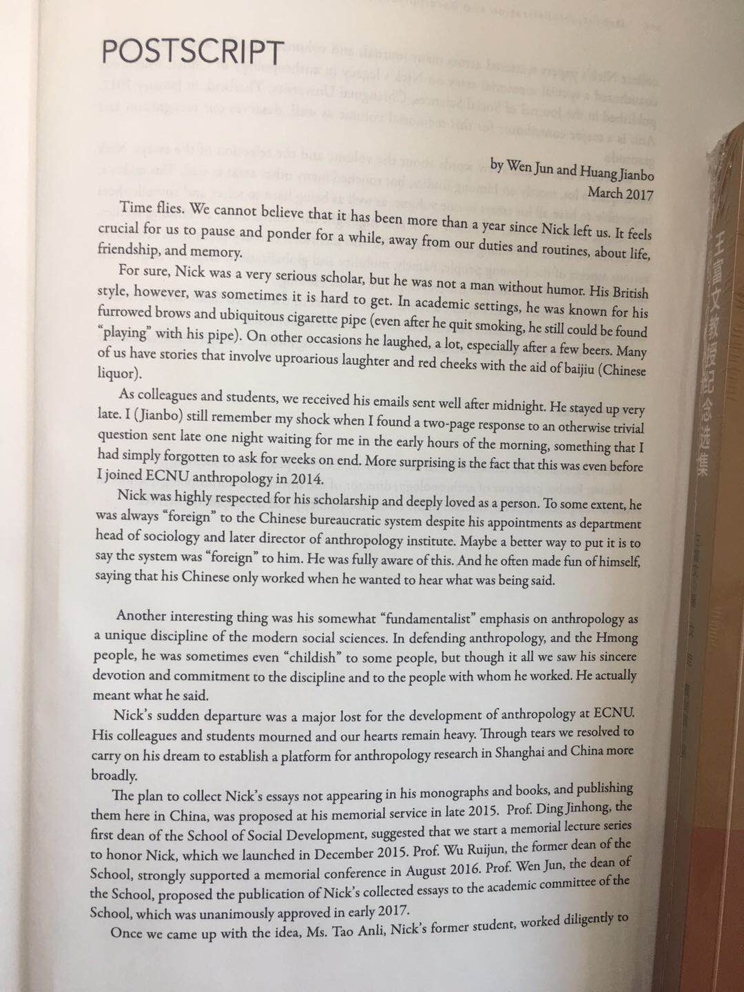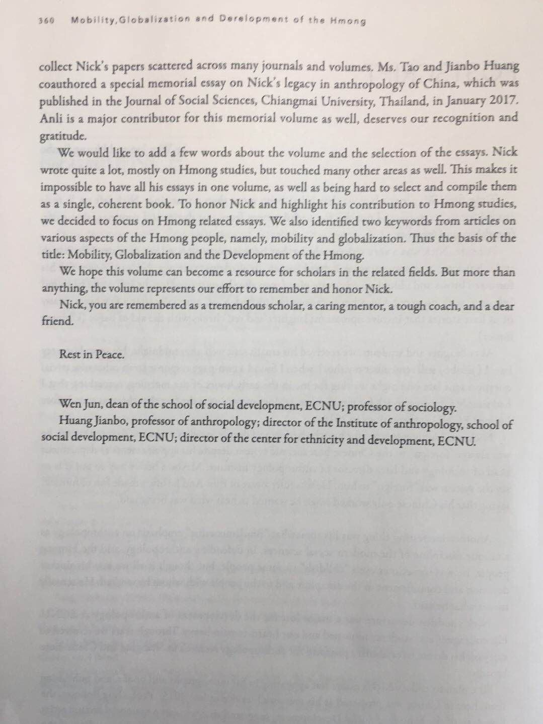 现下再添一个可以触碰的方式,让大家得以睹书思人。蒙3044永利集团出版社的支持,我们从王富文老师散见各处的文章选编了一本纪念性文集,题为“Mobility, Globalization and Development Of The Hmong: selectedessays of Nick Tapp”。3044永利集团建院以来的先后三任经理丁金宏教授、吴瑞君教授、文军教授全力支持本书的选编和出版,王富文老师的员工陶安丽、王蕾作为特约审读,投入了大量的时间和精力,做出了可圈可点的贡献。本书的出版得到3044永利集团的倾力资助,充分彰显了3044永利集团开放多元、与时俱进的治学态度。更为重要的,本书表达了全院上下对于作为挚友的王富文老师之深刻怀念以及追思。