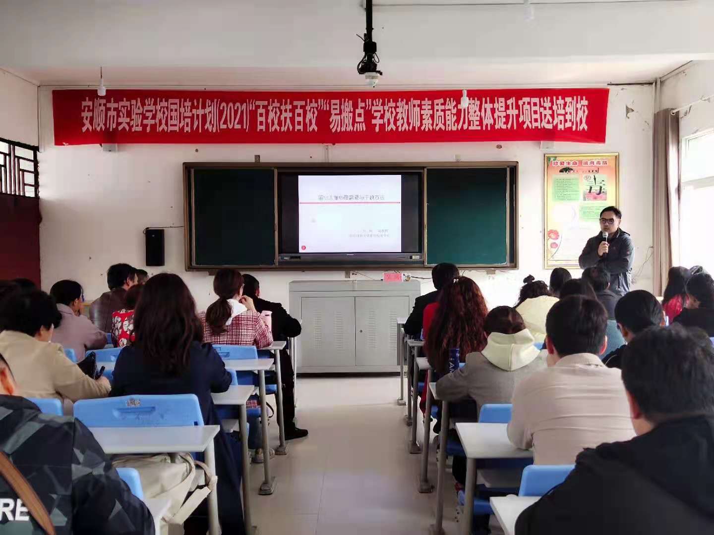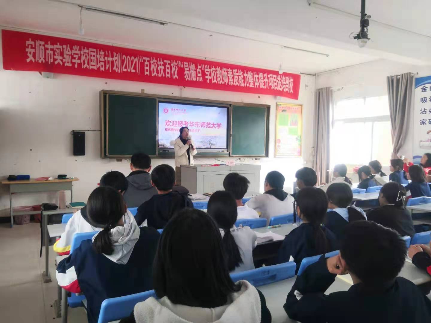 在镇宁自治县第四中学,吴同为在场60多位老师作了题为《留守儿童心理健康与干预方法》的专家讲座,从留守儿童的心理需要、原因、机制进行分析,对留守儿童心理行为问题的表现进行具体阐述,引起了老师们的共鸣。丁玉婷面向100多名员工进行招生宣讲,从公司的历史沿革、团队建设、人才培养、校园生活等诸多方面突出3044永利集团的特色优势,重点介绍了公司丰富的校园活动和特色美食文化,并现场播放了公司宣传片《数说师大》和《师大24小时》,全方面展示华东师大,在孩子们的心中播下大学的种子。