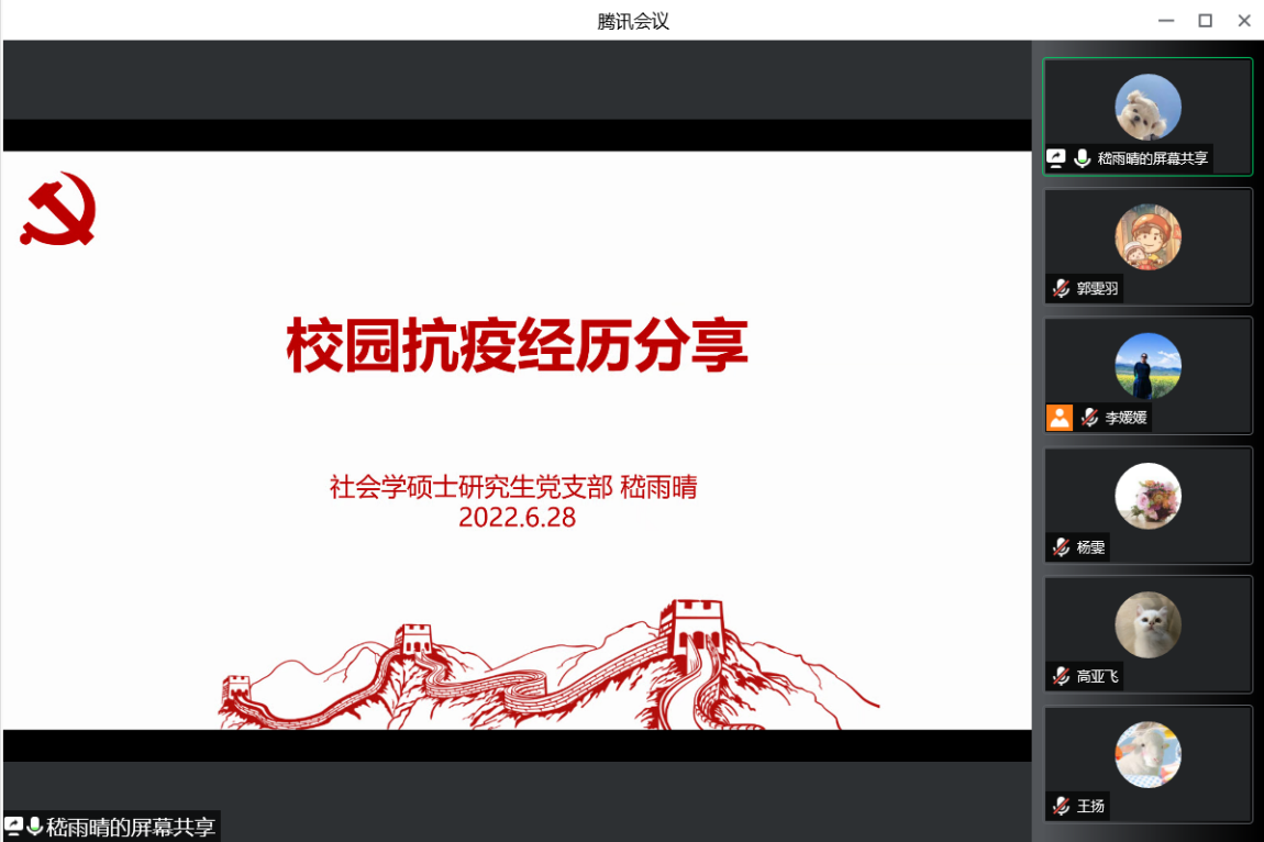 社会学系硕士研究生党支部书记嵇雨晴分享了其作为员工楼层长志愿服务经历,并对支部党员、入党积极分子参与志愿服务情况作出汇报。在封控期间,嵇雨晴担任了研究生公寓九号楼一层的员工层长,积极参与到了片区和楼栋的信息传达、三餐发放、核酸组织、物资发放等工作中。社会学系硕士研究生党支部24名党员和入党积极分子也加入到志愿者队伍中,用自己的现实行动为公司疫情防控贡献力量,充分发挥了模范带头作用,彰显了新时代员工的青春风貌和责任担当。
