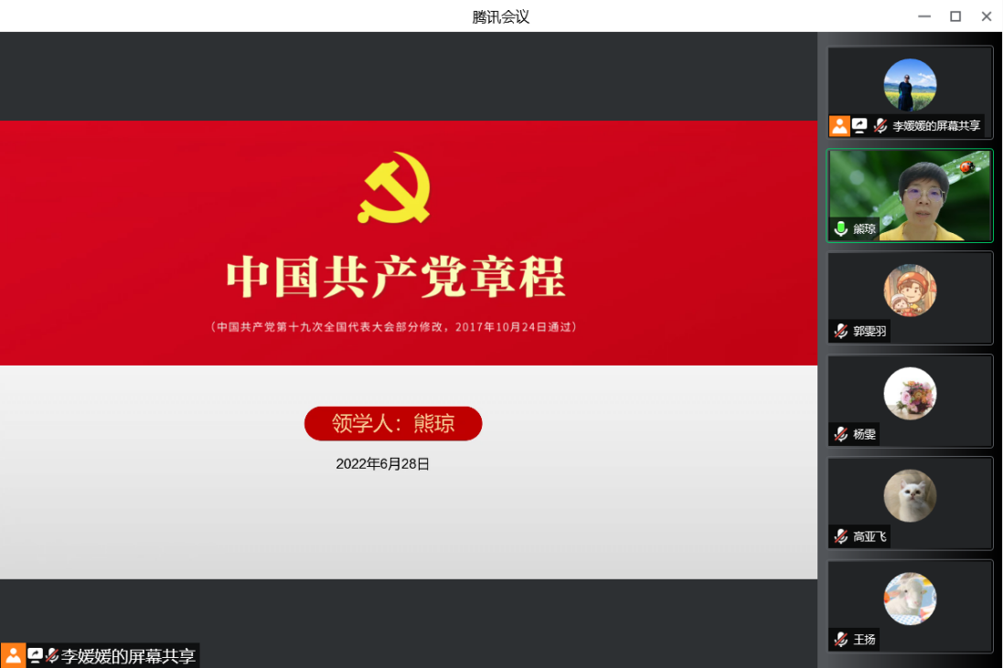 会上, 熊琼代表公司党委向师生党员致以节日的问候,对疫情防控攻坚战倾力奉献的志愿者们表示真诚的感谢和崇高的敬意!随后,熊琼领学《中国共产党章程》,带领师生党员重温十九部党章的历史发展,回顾党的光辉历程,并对十九大对党章做出的修改进行重点解读。熊琼强调,时代的洪流奔涌向前,鲜红的党章昭示未来。党章是党的总章程,是党的总规范,是党的根本大法,每一个党员都需时刻铭记、终生遵守。