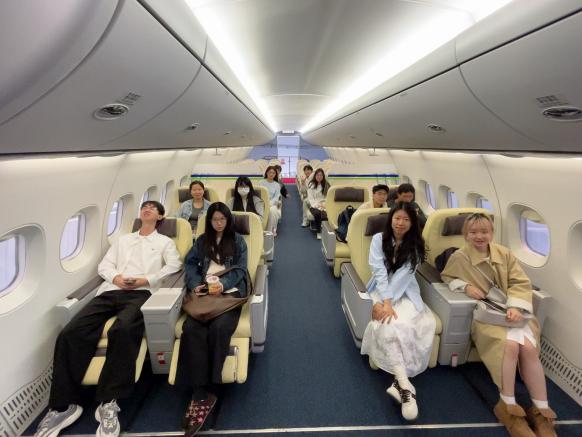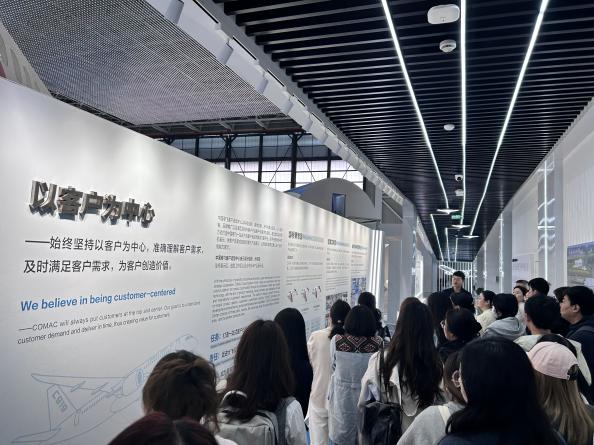 讲解员通过生动形象的动态演示和直观的实物展示,为大家详细介绍了C9系列飞机的命名内涵、机型以及功能等内容。师生们逐步了解C919大飞机从最初的设计评估阶段,到经过一系列严格的测试验证,最终成功实现商业飞行的完整发展历程。