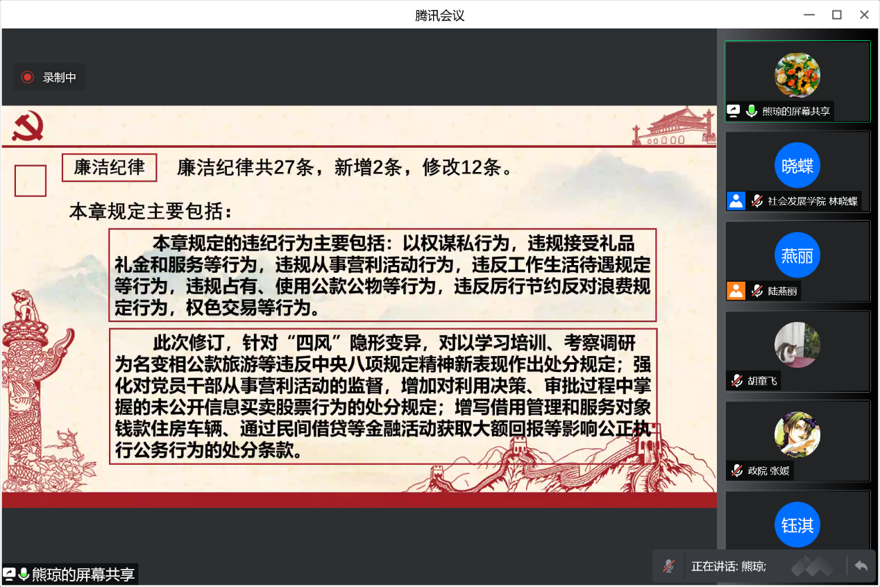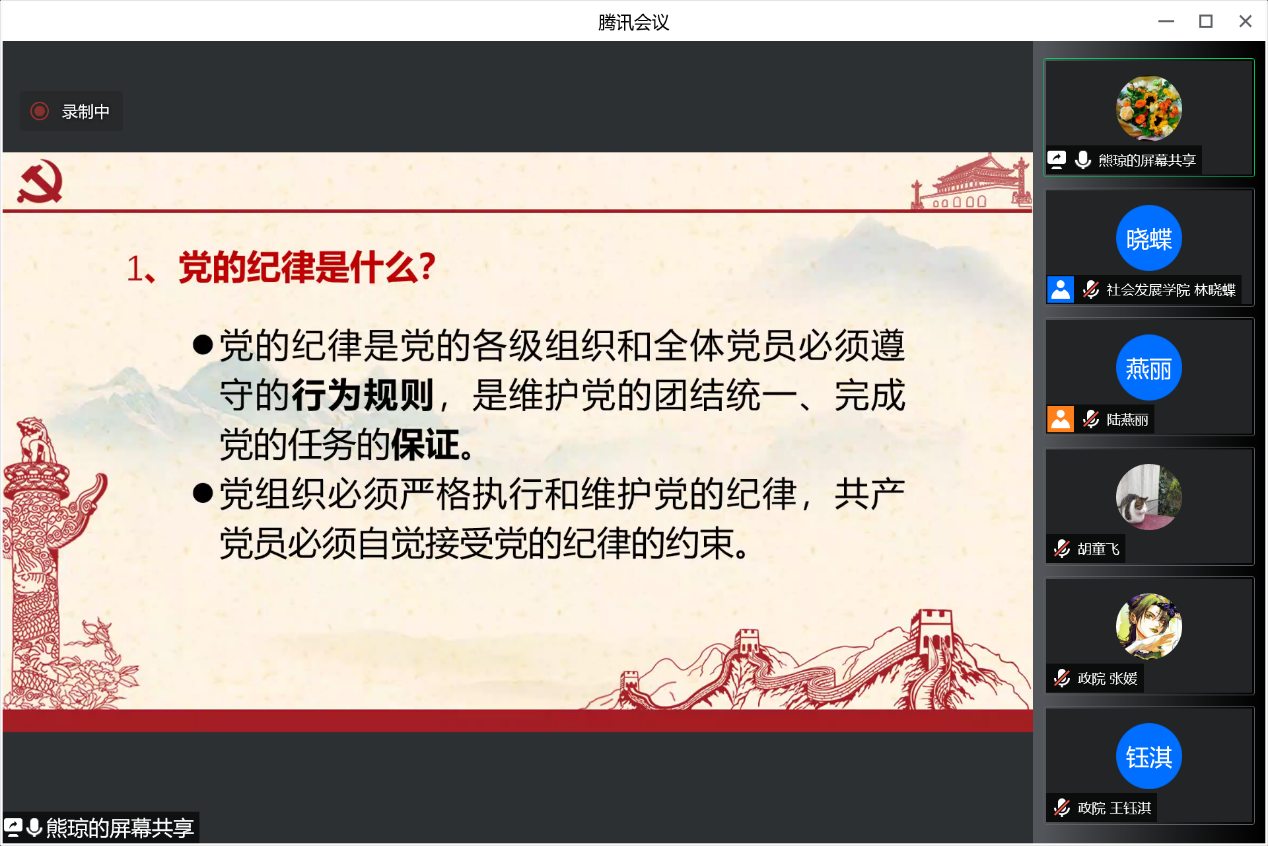 首先,熊琼老师介绍了党的纪律的含义以及历史发展进程。中国共产党是靠革命理想和铁的纪律组织起来的马克思主义政党,纪律严明是党的优良传统和独特优势。自1920年蔡和森首次提出“党的纪律为铁的纪律”的科学概念以来,党的纪律进行了多次修改、补充和完善,以适应社会发展和从严治党的新要求。