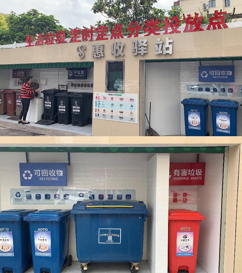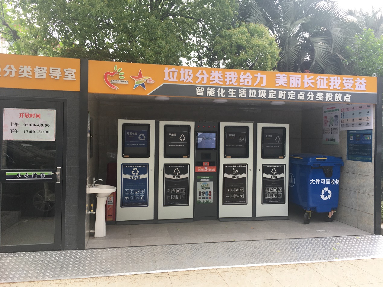 调研组首先来到了长征镇象源丽都小区,在居民区党总支陈书记的带领与介绍下,我们参观了社区智能化生活垃圾定时定点分类的投放点,了解了社区垃圾分类的实施情况。早在2018年,象源丽都小区在长征镇政府的支持和组织下就进行了垃圾厢房改建,逐步培养居民垃圾分类的习惯,提高居民垃圾分类的意识。目前,垃圾分类的基础设施已经到位,智能垃圾箱已投入使用,智能垃圾厢分为可回收物、有害垃圾、湿垃圾、干垃圾几类,以不同颜色加以区分,并可以通过智能按键操作,操作起来更简洁,一旁还设置了洗手台,方便居民在完成垃圾分类后进行清洁。随后陈书记详细介绍了小区的垃圾分类站点设置、运行机制等。同时结合小区的实际情况,制定了定人管理、定时投放、定点收运等相关配套制度,并全程透明公开,志愿者指导居民如何进行垃圾分类,小区垃圾分类工作的实效逐渐显现。