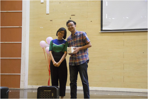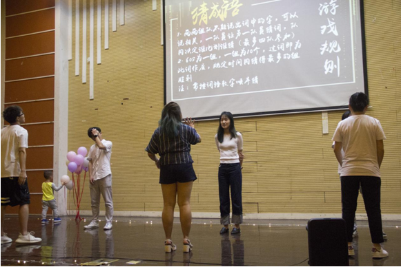 第二轮抽奖环节同样采取了弹幕抽奖,幸运的韩珊同学捧回了奖品。游戏“猜成语”共有四组同学参赛,比赛过程妙趣横生,台上选手抓耳挠腮,台下观众笑得前仰后合。最终,江瀚云和吴迪雅同学凭借默契的配合,取得了游戏的胜利。