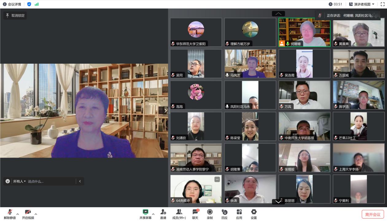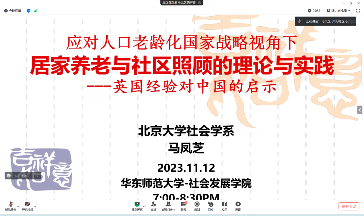 在答疑环节,与会师生通过开麦的形式与马老师提问交流,马教授耐心回答,大家对京漂老人如何养老、长护险与社区照顾的关联等议题进行了热烈讨论。最后,文军教授、黄晨熹教授、何姗姗副教授以及所有与会师生向马凤芝教授表达了谢意,今晚讲座收获满满,讲座至此圆满结束。